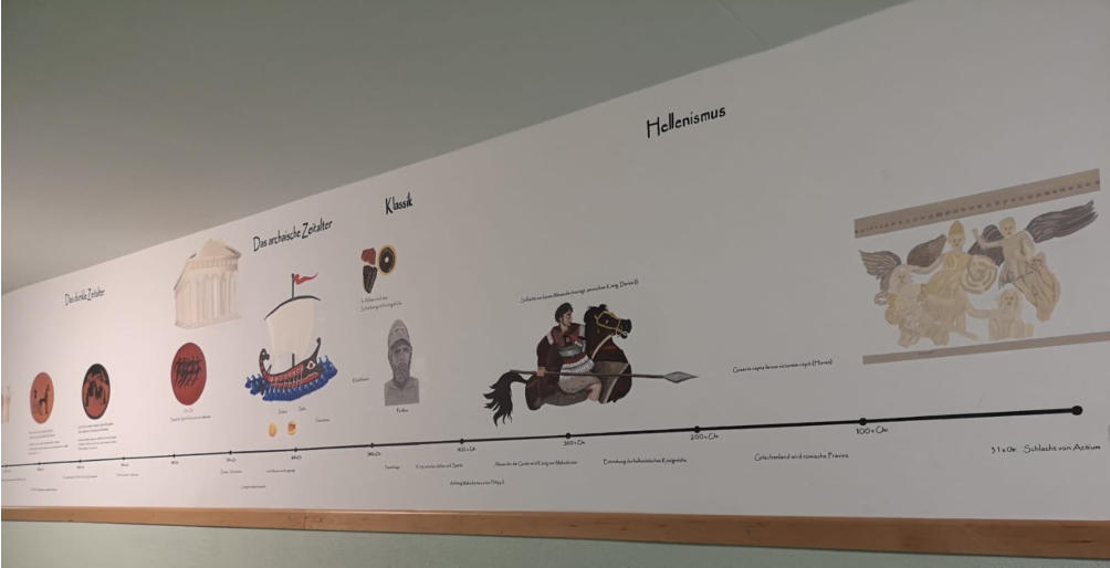 Galerie im Keller Wie bereits im letzten Jahr haben es sich Frau Schwan und Frau Dr. Greco zur Aufgabe gemacht die Wände im Keller unseres Schulhauses zu verschönern. Ziel war es das Antike Griechenland mithilfe eines Zeitstrahls und passender Bilder zu visualisieren. Damit dies gelingen konnte, suchten sie nach Freiwilligen, die ihnen in der Projektwoche, welche am 11.06.2019 begann und am 14.06.2019 endete, bei dieser Aufgabe helfen würden. Nach einer kurzen Besprechung vor der Projektwoche zur Gruppeneinteilung und, um den Schülern die Vorstellung von Frau Schwan und Frau Dr. Greco schon einmal näher zu bringen, ging es dann am Dienstag, den 11.06.2019, mit den ersten Vorbereitungen los. Im Gegensatz zum letzten Jahr meldeten sich deutlich mehr Schüler für dieses Projekt, wodurch es möglich war, die Schüler in fünf Gruppen einzuteilen, entsprechend den fünf Zeitaltern, in die sich das Antike Griechenland einteilen lässt. Bevor wir begannen, die Bilder an die Wände zu malen, wurden sie zuerst weitestgehend vorgezeichnet. Dies gelang indem die gewünschten Motive auf Folien gedruckt wurden und dann mithilfe von Overhead- Projektoren auf den Wänden abgebildet wurden. Somit beschäftigten sich die Schüler am ersten Tag vor allem mit dem Vorzeichnen des Zeitstrahls und der verschiedenen Motive, wie zum Beispiel verschiedene Vasen, Masken, Tempel, Münzen oder sogar der Pergamonaltar. Nachdem das geschafft war, begann das Ausmalen der Motive, wobei alle besonders darauf geachtet haben, passende Farben anzumischen und es möglichst realistisch aussehen zu lassen. Je weiter wir uns dem Ende der Woche näherten, desto mehr hatten wir das Gefühl, das Projekt nicht beenden zu können, doch dank einiger Überstunden und der gegenseitigen Hilfe der Schüler auch über ihre Gruppen hinaus, gelang es uns, alles vor dem Beginn des Schulfestes fertigzustellen.Alle Mitwirkenden sind sehr stolz und zufrieden mit dem Ergebnis.Marta Böttcher, 12aFachbereich Latein September 2025